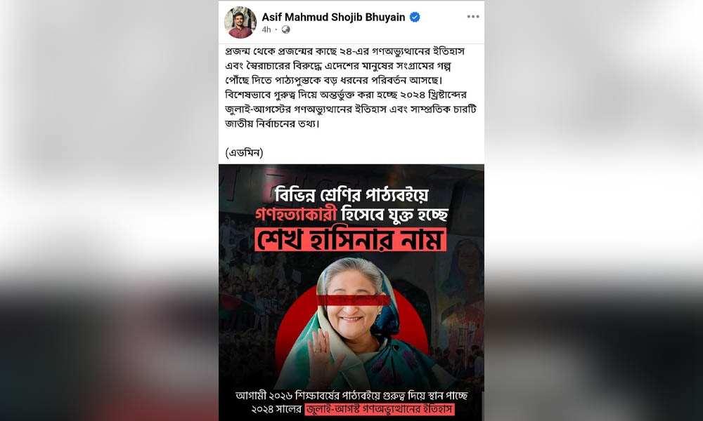 আগামী ২০২৬ শিক্ষাবর্ষে মাধ্যমিকের বিভিন্ন শ্রেণির পাঠ্যবইয়ে গুরুত্ব দিয়ে স্থান পাচ্ছে জুলাই গণ-অভ্যুত্থানের ইতিহাস। এতে গণহত্যাকারী হিসেবে ক্ষমতাচ্যুত প্রধানমন্ত্রী শেখ হাসিনার নাম অন্তর্ভুক্ত হচ্ছে। স্থানীয় সরকার উপদেষ্টা আসিফ মাহমুদ সজীব ভূঁইয়া তাঁর ভেরিফায়েড ফেসবুক পেজে (অ্যাডমিন পোস্ট) এ তথ্য জানান। ওই পোস্টে লেখা হয়েছে, ‘প্রজন্ম থেকে প্রজন্মের কাছে ২৪-এর গণ-অভ্যুত্থানের ইতিহাস এবং স্বৈরাচারের বিরুদ্ধে এ দেশের মানুষের সংগ্রামের গল্প পৌঁছে দিতে পাঠ্যপুস্তকে বড় ধরনের পরিবর্তন আসছে। বিশেষভাবে গুরুত্ব দিয়ে অন্তর্ভুক্ত করা হচ্ছে ২০২৪ খ্রিস্টাব্দের জুলাই-আগস্টের গণ-অভ্যুত্থানের ইতিহাস এবং সাম্প্রতিক চারটি জাতীয় নির্বাচনের তথ্য।’